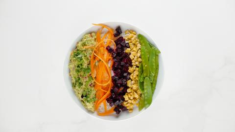 Τα χρώματα του ουράνιου τόξου στο πιάτο σου! Ένα υπέροχο vegan γεύμα που θα σε ενθουσιάσει με την χρωματική και γευστική ποικιλία του. Οι αναλογίες είναι υπολογισμένες για να δημιουργούν τέλεια ισορροπία από γεύσεις και υφές με αποτέλεσμα την οπτική και γευστική απόλαυση. Από το μαλακό και αφράτο ρύζι, το κρεμώδες και δροσερό guacamole έως τα τραγανά ολόφρεσκα λαχανικά, αυτό το vegan rice bowl θα συνοδεύσει ιδανικά τα καλοκαιρινά σου βράδια. Και το καλύτερο; Θα σου πάρει μόλις 30 λεπτά για να το ετοιμάσεις!
