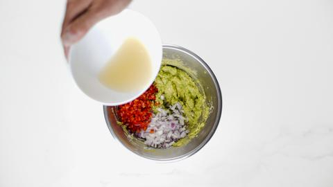 Έπειτα προσθέτουμε την πιπεριά, το κρεμμύδι, το χυμό lime και ανακατεύουμε. Δοκιμάζουμε και διορθώνουμε με αλάτι και πιπέρι όσο χρειάζεται.