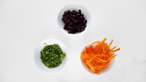 Κόβουμε το παντζάρι σε μικρούς κύβους, ψιλοκόβουμε τον κόλιανδρο και με τη βοήθεια ενός αποφλοιωτή κόβουμε το καρότο σε λεπτές λωρίδες, σαν ταλιατέλες.