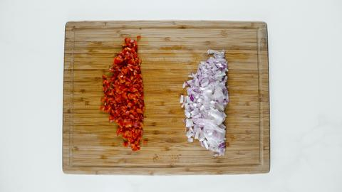 Κόβουμε το κρεμμύδι και την πιπεριά σε μικρούς κύβους.