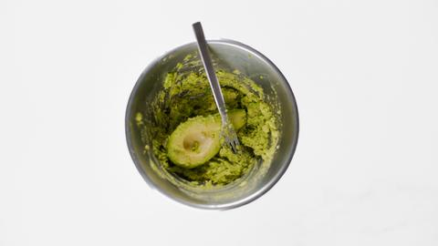 Σε ένα μπωλ τοποθετούμε το αβοκάντο και το λιώνουμε με ένα πιρούνι.