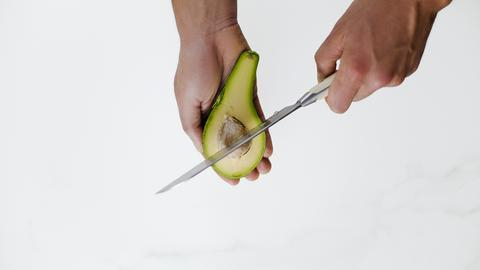 Κόβουμε το αβοκάντο εγκάρσια, αφαιρούμε το κουκούτσι και τη φλούδα.